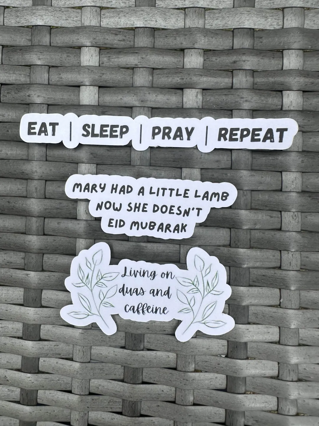 A set of three Muslim-like joke stickers with unique designs and messages.
